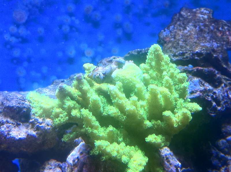 Den farve som koral nr 2 har på spidserne, kunne godt ligne den farve de får hvis der kommer ufilteret uv lys ned til den.