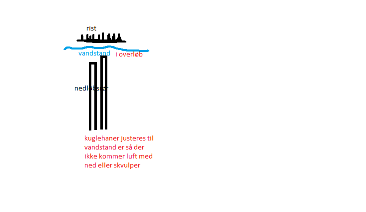 men hvor højt fra overløbet sidder nedløbsrørene og hvor hurtigt er din pumpe og sidder der kuglehaner på alle nedløb :wink: