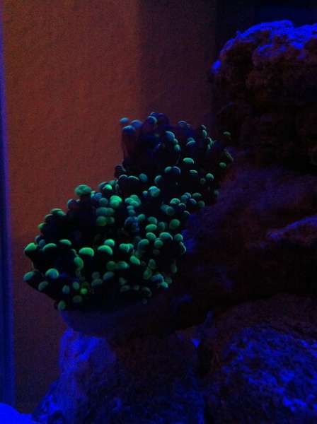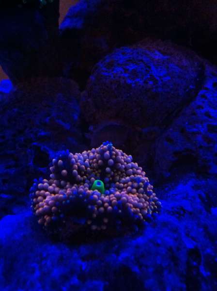 , pt har jeg 3 klovne i, startede med 2, en havde en sygdom, så forhandleren gav 2 for 1's pris bagefter selv om jeg helst ville have haft 2 i alt på det tidspunkt, men så er der da lidt kamp om dominans. Ellers har jeg en dannebrogreje, en krebs og snejle. Så har jeg lavet et lille fejl køb og kommet til at sætte en anemone i ret tidligt, men det ser ud til den trives og har fundet sin plads efter 2 uger kamp. Klovnene er dog lidt ligeglade med den endnu. Er lidt i tvivl om hvilke navne mine koraller har. men ved den mest lyskrævne skulle være richordeaen og tror også den har det godt