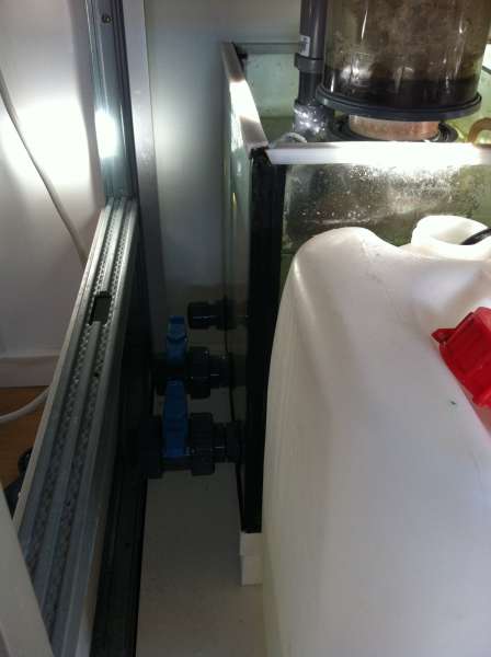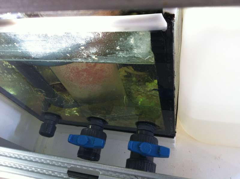 Her kunne jeg jo så benytte 2 ud af de 3 gennemføringer, da disse diametre er mindre end skummerens udløbsdiameter. Der hvor den store kuglehane er limet på...