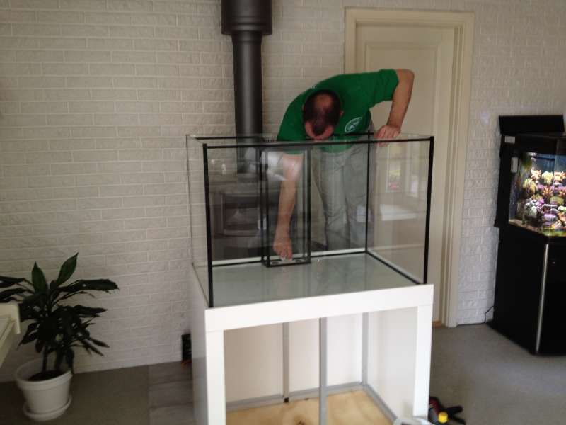 Jeg fik også flyttet min Boyu, og sat det nye akvarie på plads. Carsten har så lavet resten af rørføringen og hans snedker har monteret lågerne. Det er bare i orden håndværk de har lavet, både Carsten, snedkeren, maleren og dem der har limet akvariet (fotografen er så til gengæld en klovn :y )