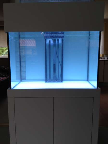 Tænkte at det sidste hold skyllevand til stenene ligeså godt kunne være i akvariet: Den høje søjle venter jeg med til der kommer saltvand i, for den ligger allerede i saltvand med en sten fra min Boyu, og har ligget der i over en en måned. Tanken er at den skal skal stå næsten helt fremme ved frontruden, ca. 1/3 inde fra venstre side.