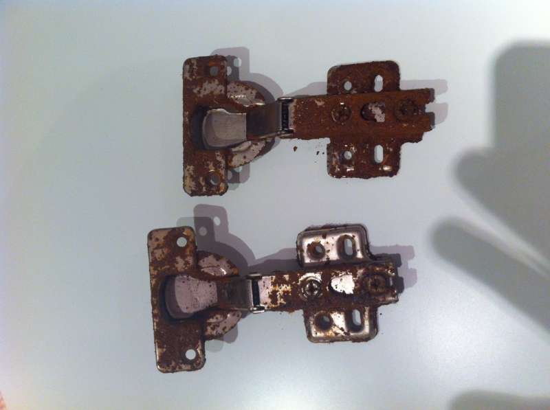 Jeg har ikke set dine rustne hængsler, men formoder de er "elforzinket" hvilket er en meget billig overfladebehandling. Dvs. en art tynd zinkbelægning ovenpå metal(jern). Dette er meget anvendeligt på indendørs beslag til skabe, køkkener etc., men mindre egnet til akvariemøbler pga. den "salttåge" der opstår i et sådant skab.