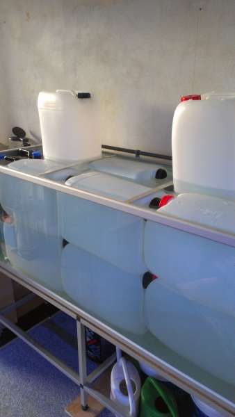 Vi har bare fyldt friskblandet saltvand i dunkene. Så åbnes der bare for et antal dunke hver uge.