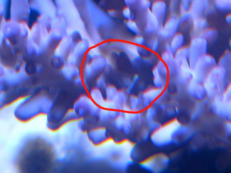 Er der nogen der ved hvad det er for en fætter der holder til i min acropora? På billedet kan man se hovedet. Gætter på øjnene er placeret i hver sin ende af den hvide streg. Bag hovedet kan man se maven, resten er helt gennemsigtigt. Beklager jeg ikke kan få billedet skarpere.