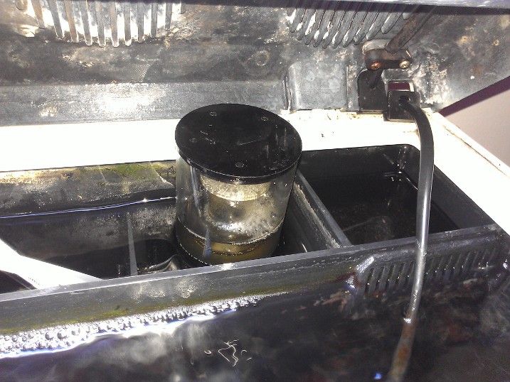 Jeg har siden jeg flyttede for et par måneder siden haft problemer med alger, så jeg har derfor sat en lille AquaLight nano luftskummer på. Det er ikke til at sige om det hjælper på algerne endnu, men lidt grumset vand der ligner stærk grøn the, fjerner den da hver dag. Den bliver drevet af en justerbar Schego luftpumpe (200L/h) der kører 24/7. Jeg er ikke super imponeret over den håndværksmæssige kvalitet af skummeren (koppen er lidt bøvlet at sætte på), men den kostede også kun 15,50 euro. Det var lidt et sats da jeg ikke på forhånd vidste om der var plads i den lille sump bag i akvariet.