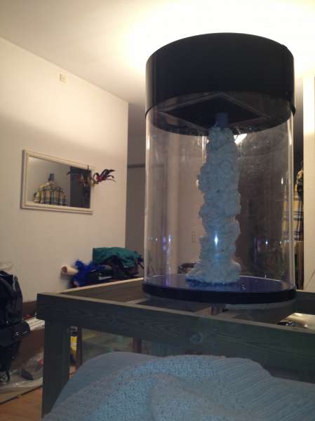 har lavet en gennemføring og sat en ø40 blød slange på til vand ned til sumpen. inde i den på ø40 går der en mindre slange til returpumpen. disse går begge til toppen af akvariet og har så sat et plexi rør ud over for at holde det oprejst. Planen er at bruge pu skum til at dække røret ind og til opbygningen af stensøjlen. så alt teknik bliver skjult 100% . Har en sump på 200 ltr hvor der kun skal være l.s. i så regner ikke med at have nogen af dem i cylinderakvariet. Der skal nok komme mere. men tid og skole gør at processen er i sneglefart desværre ;)