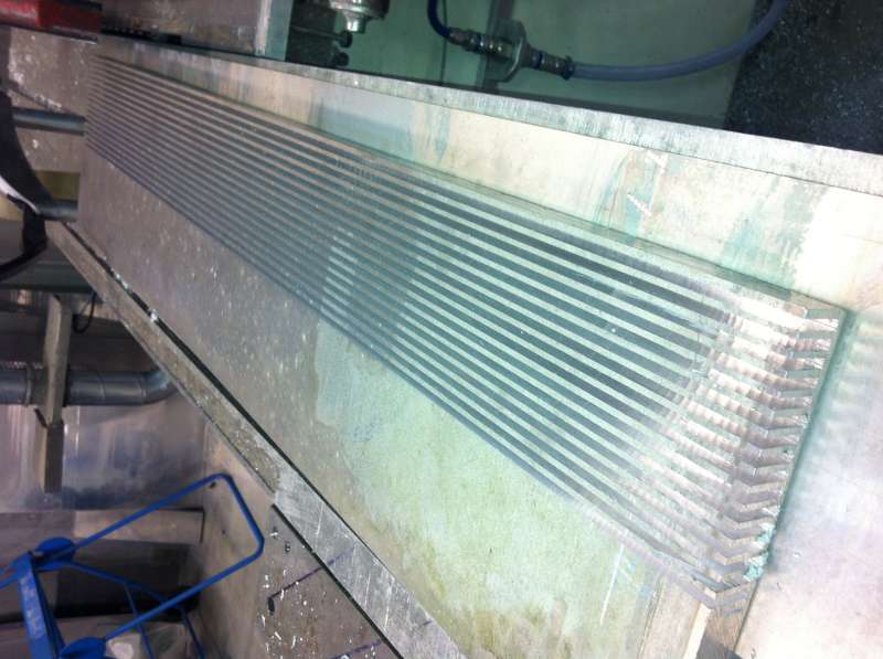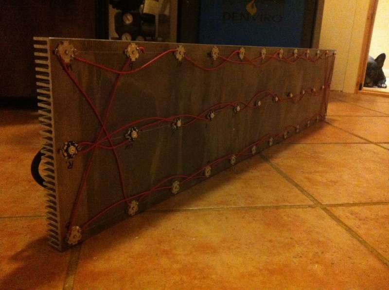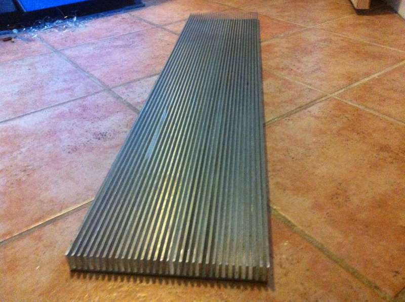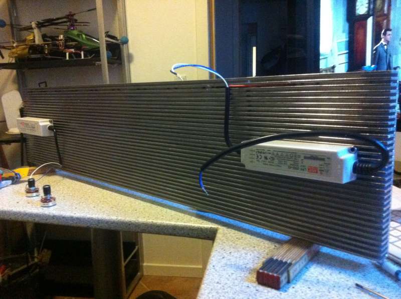 køle skinnen har jeg lavet af søvandsbestandigt alu-plade på 1020x220x25mm den er 4mm i bund tykkelse køle ripper er 3mm imellem ripper er der 4mm så det passer at man ku skære gevind 5mm til at skrue driver fast ledninger fra driver er boret ned igennem. har skruet alle led fast med 3mm skruer og en dråbe køle pasta imellem, led valgt jeg at skrue fast for så var jeg helt sikker på de ikke slipper og er nemme at skifte og har en rigtig god kontakt til alu-pladen :wink: