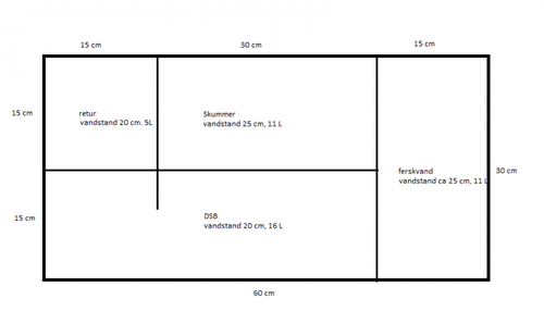 Jeg er i tvivl om hvordan jeg udnytter de få liter bedst og hvilke rum det skal indeholde indtil videre er jeg kommet frem til ferskvandskammer, skummerrum, rum til DSB/refugium og retur.