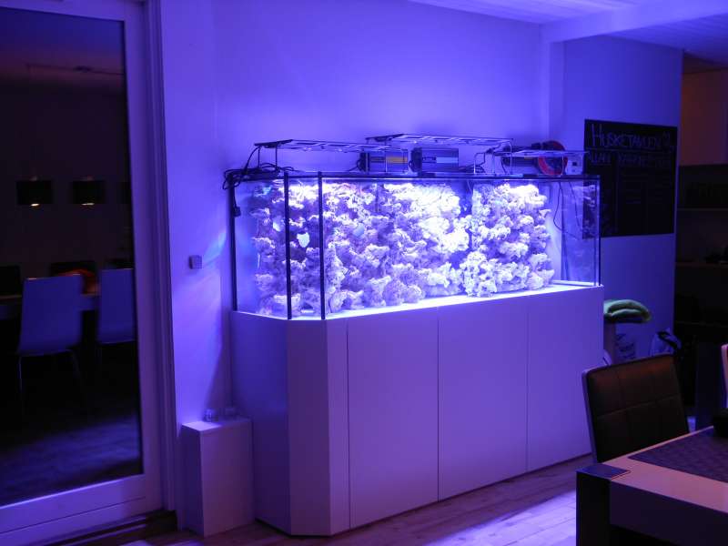 Efter flere omrokeringer, endte resultatet i knap så meget revkeramik og mere svømmeplads, end hvad der først var tiltænkt. Vandværdierne er stabile efter tilførsel af Sango Kai, da jeg har det luksus problem at min var er for rent. Linserne på lamperne er skiftet til de nye fra Maxspect.. Så det hele er ved at køre rigtig godt og korallerne er begyndt at vokse.