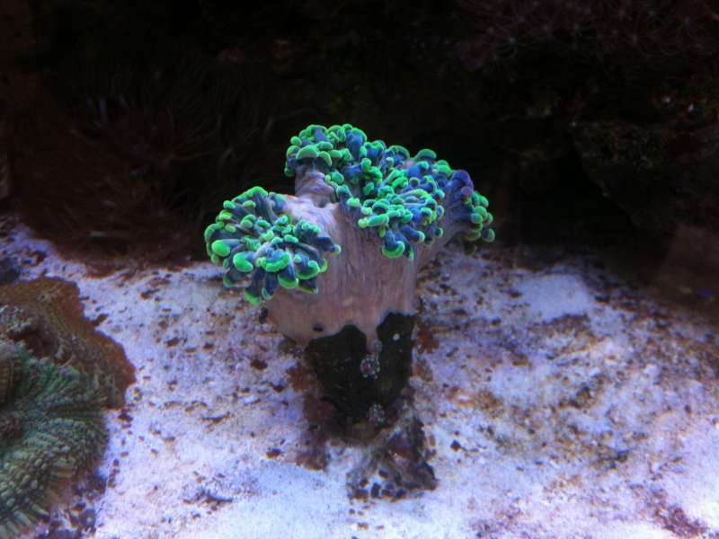 Min hammerkoral har trukket sig sammen. Den plejer at stå rigtig fint og har endda sat en masse små skud ned ad skelettet. Som det fremgår på billederne vokser mine andre koraller og står, for mig at se, rigtig pænt. Skal jeg fodre min hammerkoral eller er der andre særlige hensyn, der skal tages i forhold til den?