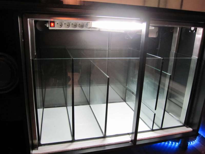 dernæst igennem et 4cm rum og over en glas kant ned i et større rum, hvor der med tiden skal laves DSB med LS ovenover, så løber vandet over i returkammeret. I sumpen skal der også være en vandtank til osmosevand.