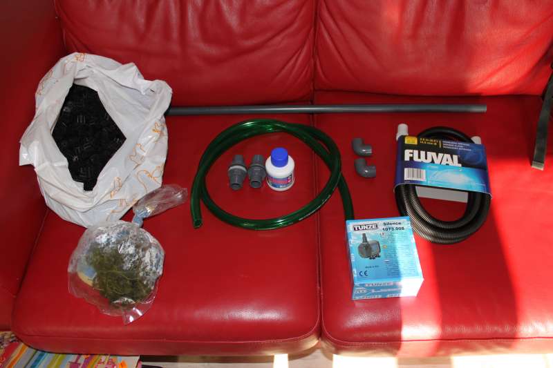 Pumpen kostede 359.- De to gennemføringer 200.- Lim 100.- Biobolde 75.- Slanger 150.- Rør og bøjninger 75.- Lille eheim cirkulationspumpe pume 129.- (dog ikke på billedet!) Ialt 1088.- :rolleyes: