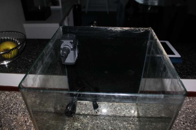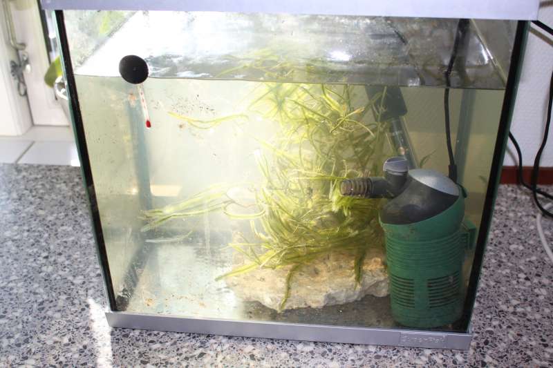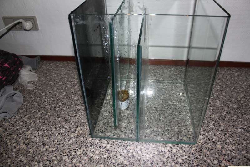Akvariet der skal bruges som sump, omkring 30 liter, der skal i limes boblefanger mv.