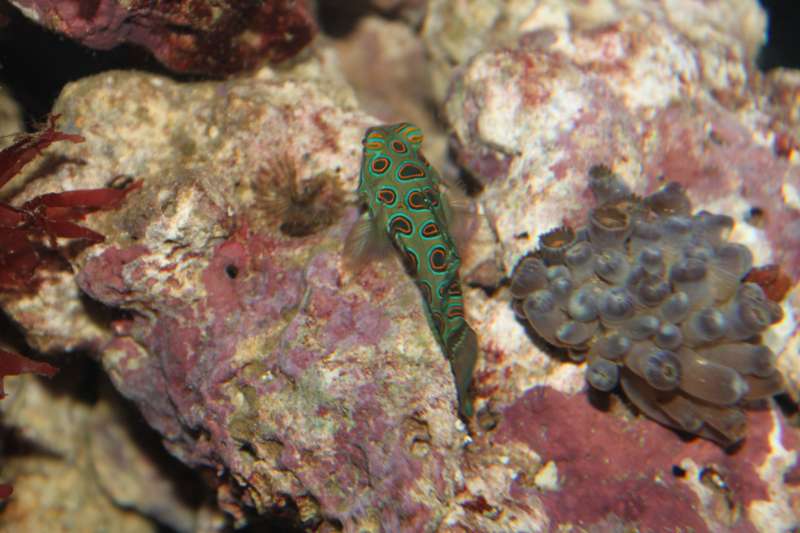 Svaret var pods, som den selv kunne finde mellem de levende sten. Det var ikke noget jeg skulle bekymre mig om iflg. ekspedienten idet disse pods alligevel var mikroskopiske, og at jeg med garanti havde masser af dem. (hvilket jo bestemt kan være sandt) Da jeg kom hjem med fisken læste jeg at den er svær at holde, og ofte sulter uarrrrkkk :( Den måned jeg har haft den har jeg således overvåget den nøje. Den søger ustandselig efter pods kan jeg se. Så standser den og tager ligesom en bid af et eller andet, gumler lidt og spytter noget ud igen.