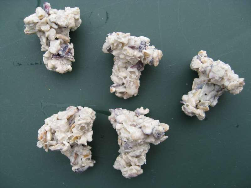 Blandede den hvide fliseklæber op, og hældte derefter en god del knust faxekalk i. Synes resultatet var ok. Lavede både nogle med et hul i, men også nogle med en revne i til Montipora.