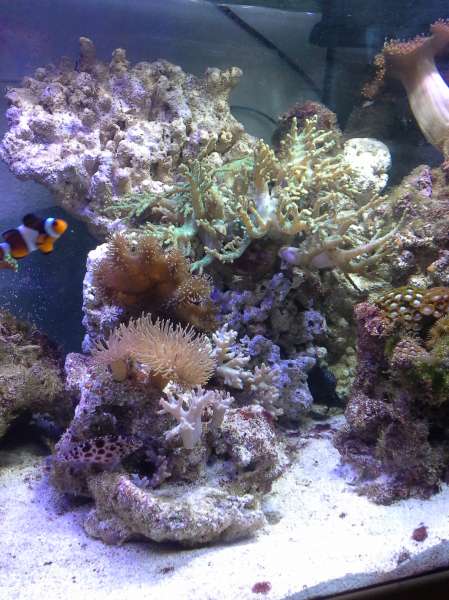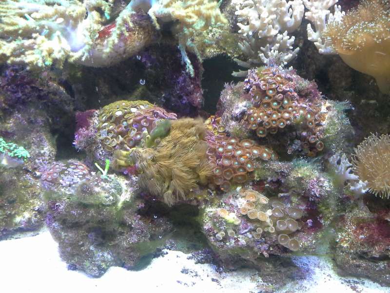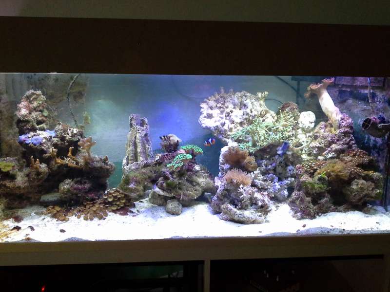 pH svinger mellem 8.3-8,4. Mg ca 1250 ca 400 og alk 8. Stensætningen er meget åben og der er god vandbevægelse omkring stenene. Jeg har en baggrund på 130x50x10, den bliver "støvsuget" ved vandskift, men den ryger på loftet nu. Jeg har ca 150 kg levende sten i sumpen, de kommer lige op og får en hurtig skylning i rent saltvand
