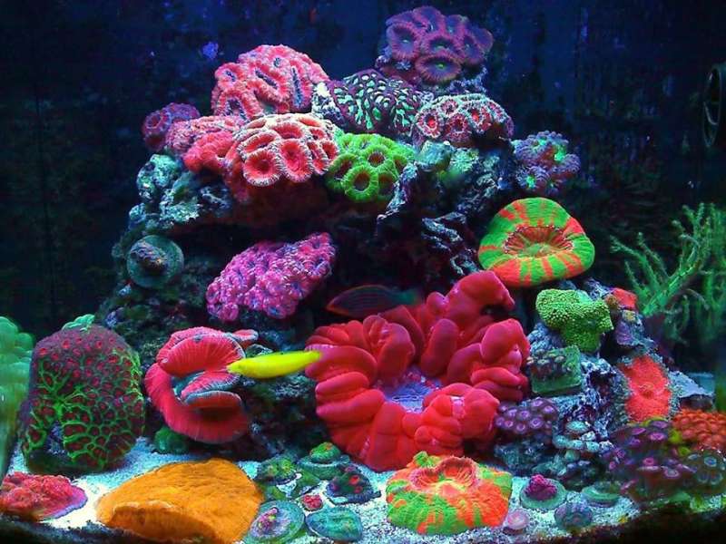 Jeg har ikke ret meget forstand på foto og kan ikke se om det er fotoshoppet, men der er helt sikkert leget med lyset for at få de optimale farver frem. Måske er det et Zeo akvarie?