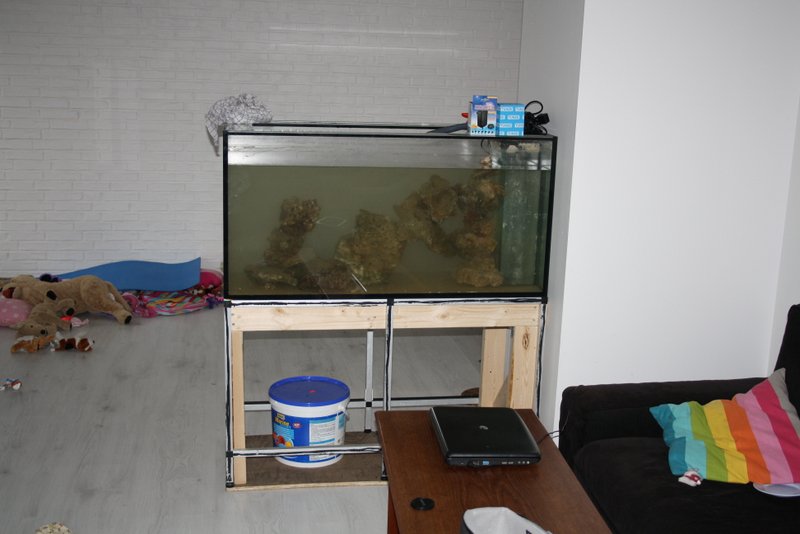 så kom akvariet op. det er savet 20cm mindre. nu er bordet kun 70cm højt og vakler helt vildt bare når min mindste rolling står og klapper på siden..Derfo har jeg bygget det ekstra træbord under porsaen. Nu står akvariet urokkeligt og også i vatter, selvom det er svært at se på de billeder her:-)