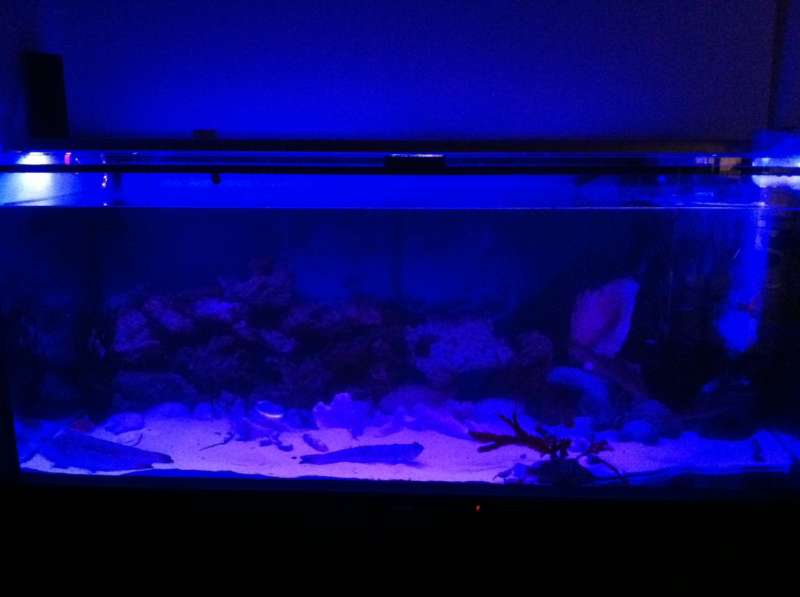 Ovenover et par nattefotos fra akvariet belyst med min hjemmebygget LED lampe som er lavet af en 5028 LED strip i forskellige farver der kan fjernstyres via en fjernbetjening. Har fundet ud af at det pæneste nattelys udgøres af mørke blå + lidt rød belysning. Lampen er også tændt om dagen sammen med min koldhvid 5050 LED strip. Det giver lidt blålige (havvand) og rødlige (sollys) nyancer og til sammen med det hvide lys er det et utrolig flot lys som man kender det fra havet omkring Caribien.