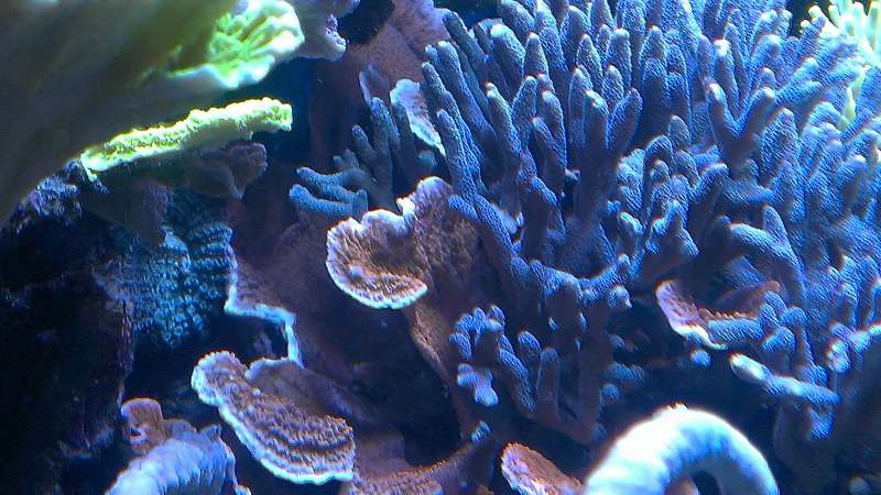 tror den kommer sig, kan se der hvor jeg har knækket den på den fragment sten jeg fik den på er der allerede kommet 3 små polypper i det hvide stykke, og det var i torsdags, men den brune/lilla montipora skygger lidt, (hvorfor kalder du den blå? :S )
