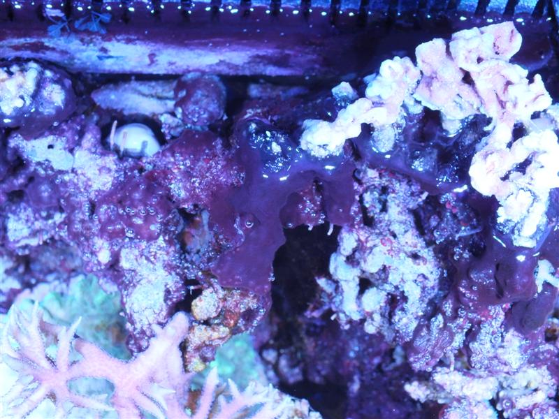 Der er både gode dårlige ting. Jeg har, primært helt oppe under lamperne og omkring overløbskammem, nogle forskellige røde - mørkelilla belægninger som jeg formoder måske er en skøn blanding af cyano og dino'er (er fyldt med luftbobler om aftenen). Det har været der meget længe, og mængden svinger op og ned over tid (måske er der mest når jeg overfodrer, hvilket jeg gør helt vildt i øjeblikket p.g.a. den nye pincet).