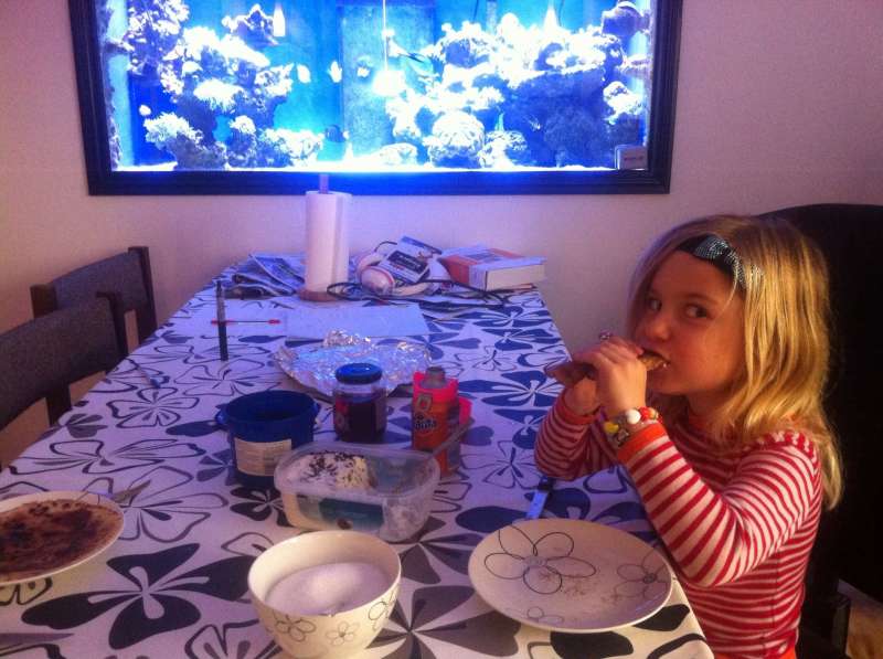 Det billede af min datter der spiser pandekager, der kan du se problemet. Alle de hvide områder i akvariet det er faktisk mine koraller.! :-(
