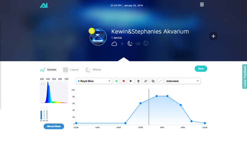 Man har et diagram hvor man kan tilføje og justere punkter på hver enkelte farvekanal over døgnets 24 timer. Til dem som ikke gider bruge for meget tid på opsætningen er der en "Easy Setup Mode" hvor man bare skal skrive hvornår man vil have solen til at gå op og ned hvor lang tid transitionen tager og hvad maximum og minimum power på dioderne skal være.