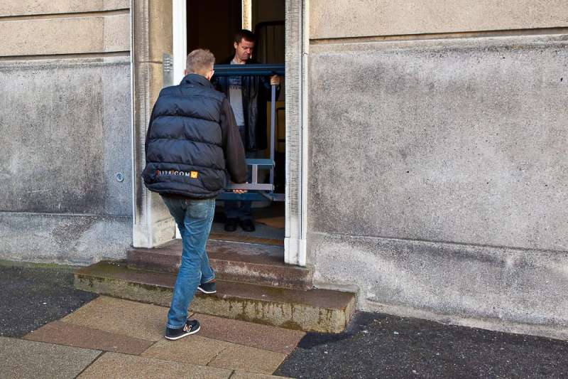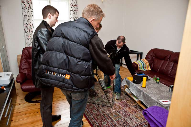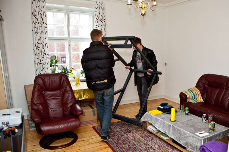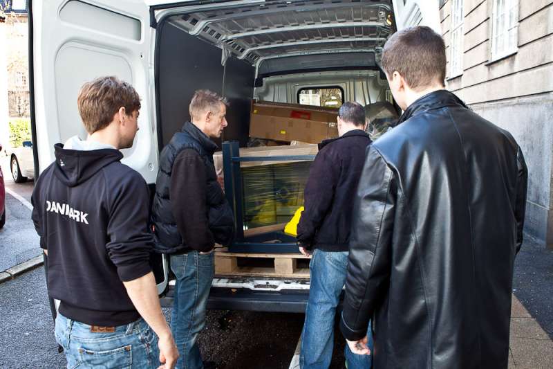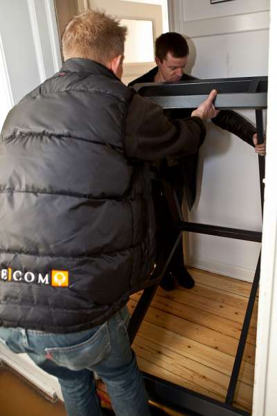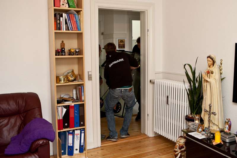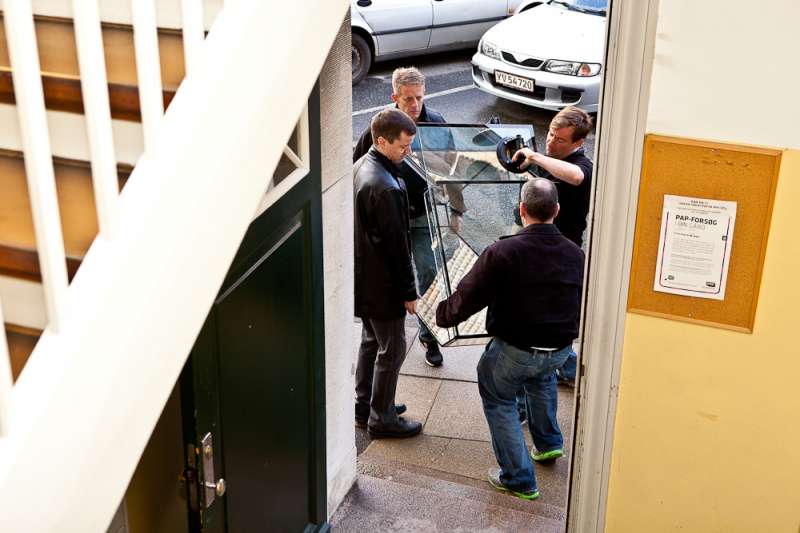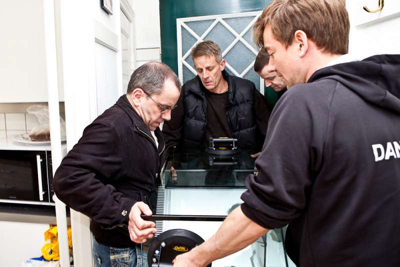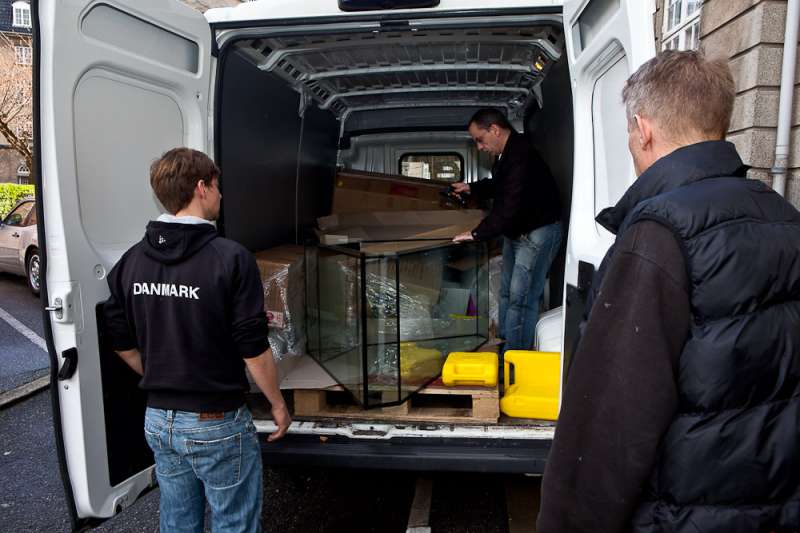 Så står det nye akvarium i vores lille stue på Østerbro. Takket være fire gode saltvandsvenner kom det ind i lejligheden. Jeg tror, at hvis baljen bare var een centimeter større fra forruden til hjørnet, så havde det nok stået nede hos carsten igen. Det fremgår med al tydelighed på billederne, at det ikke var en helt let sag. Baljen blev vendt og drejet adskillige gange før det stod i stuen,