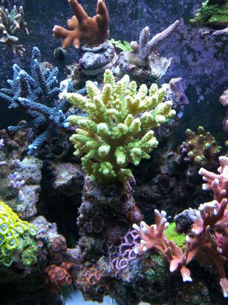 Ja så fik konen den ide, hun ville prøve Saltvand. Puha det har været en dyr beslutning, hun tog der. Haha. Efter kort tid blev jeg desværre syg, og måtte sælge mit firma. Da jeg ikke længere måtte løfte, og ikke kunne lave vandskift osv., var jeg desværre også nødsaget til at skille mig af med alle mine akvarier. Stille og roligt overtog jeg min kones saltvand - hmmm. Ikke klogt for 60 L var jo ikke nok. Så jeg fik hurtigt gang i et alm. 325 liters med 85 liters sump. Det har nu kørt i ca. 1½ år. Som I vil se på billederne - er SPS og Zoa nok det, som jeg har haft en svaghed for. Lige nu er der ca. 65 forskellige SPS’ere. Tidligere var jeg oppe på ca. 75 forskellige Zoa`s. Der er nu ca. 25 slags tilbage nu.