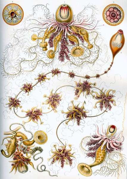 Some examples of hydrozoans are the freshwater jelly (Craspedacusta sowerbyi), freshwater polyps (Hydra), Obelia, Portuguese man o' war (Physalia physalis), chondrophores (Porpitidae), "air fern" (Sertularia argenta), and pink-hearted hydroids (Tubularia).