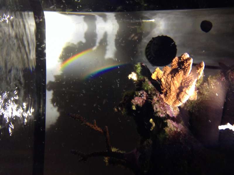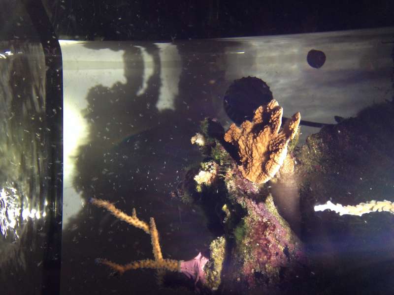 Igår aftes ved 23.00 tiden da jeg sidder og kikker i akvariet med lommelygten efter "nat" dyr går den ene danebrogsreje så ud på kanten af stensætningen og smider alle de små rejer lige ud i strømmen fra pumpen
