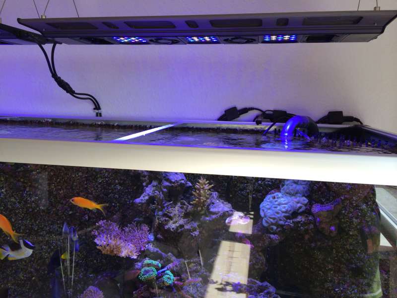 Ovenover hænger 2 Razor 160W, som når de er på toppen, lyser med 80% styrke. De hænger ca 30-40cm over korallerne.