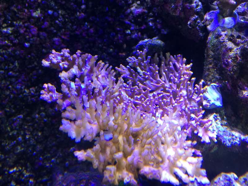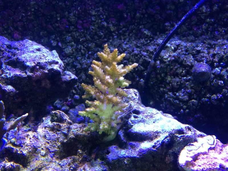 er efterhånden ved at havde fået kalkreaktoren indstillet rigtigt osv, men har overfodret i en periode, så næringen er steget helt vildt og der er kommet en smulge cyano som også kan ses på billedet, så regner med at få styr på det, men korallen kan redes ved at klippe stykket af?