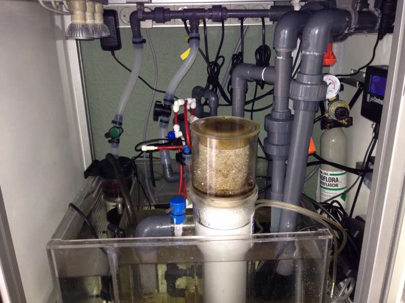 Jeg har derfor fjernet pumpe og venturi. I stedet har jeg monteret en Eheim Compact 600 på en 90 gr. PVC bøjning. I denne bøjning har jeg boret 2 huller til luftslange og inde i skummeren har jeg sat 2 luftsten. Luften kommer fra en Aqua Medic Mistral 2000 luftpumpe.
