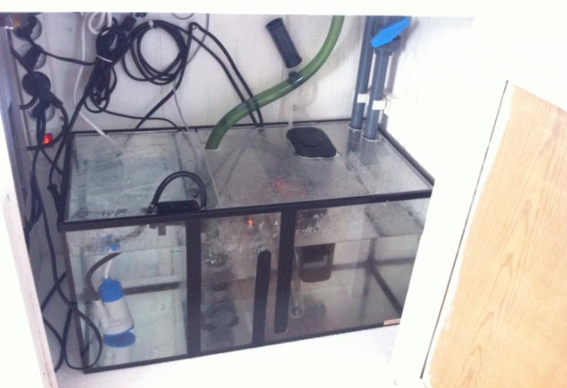 Sumpen er endelig HELT færdig og det ser ud til at fungere rigtig godt. Jeg mangler kun en filtersok under nedløbet fra akvariet, samt en lille reaktor til rowa. Skummeren suger luft fra bagsiden af skabet, gennem en luftslange, som går gennem skabets bagvæg.