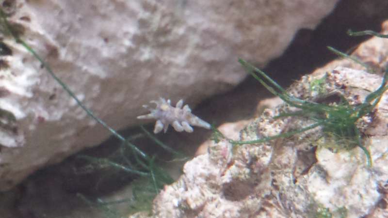 Vi købte et brugt akvarium for en lille uge siden som var helt tilgroet af alger/tang noget. Var en tur i decocean, og købte nogle dunke vand med hjem. Nu har det så kørt i nogle dage og alt ser ud til at fungere som det skal. Opdagede idag til min store overraskelse et lille violet/lilla dyr kravle/snegle sig rundt på en af stenene. Har forsøgt at tage et billede, håber i kan se det