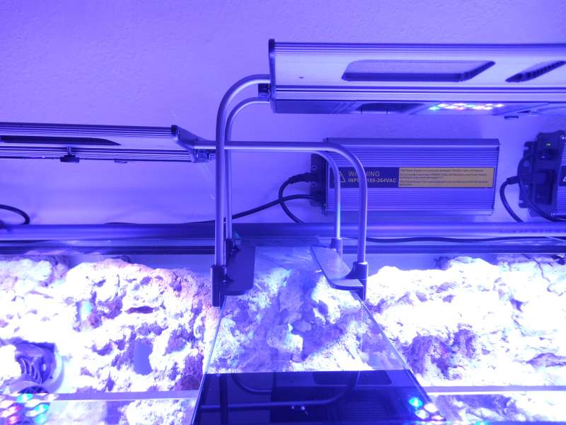 Så kom der lys over baljen. De er monteret i de medfølgende holdere og jeg har været så heldig, at de akkurat passer mellem afstiverne på akvariet