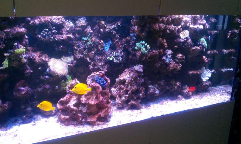 Efter flere omrokeringer, endte resultatet i knap så meget revkeramik og mere svømmeplads, end hvad der først var tiltænkt. Vandværdierne er stabile efter tilførsel af Sango Kai, da jeg har det luksus problem at min var er for rent. Linserne på lamperne er skiftet til de nye fra Maxspect.. Så det hele er ved at køre rigtig godt og korallerne er begyndt at vokse.