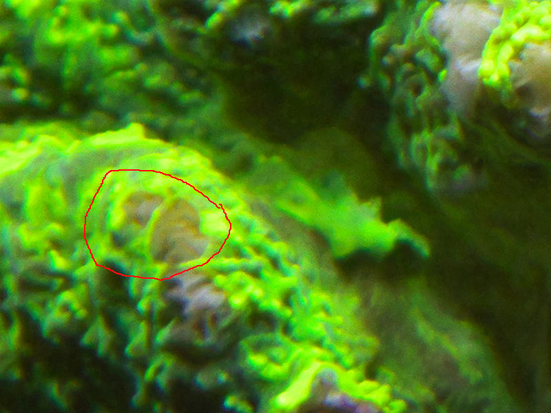 Jeg har en stor Hydnophora hvor der er flere steder er begyndt at komme nogle pletter med brun belægning (rød cirkel). Dagen efter er der så et større stykke med hvidt skelet der hvor den brune plet var.