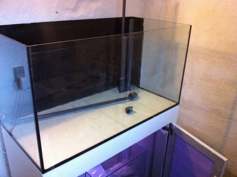 Så fandt jeg et akvarie der skal bruges som sump. Den nuværende er lige stor nok, hvorfor jeg har valgt en på 60 liter. Den skal kun rumme ATS, varmelegeme og retur. Måske filtersokker. Jeg forestiller mig et underskab med god orden, dvs kabelskjulere til ledninger og godt med luft så man kan arbejde og komme omkring. Ligeledes skal der være plads til en stor osmosevand beholder, da fordampningen nok bliver stor fra akvariets overflade. Sumpen bliver overdækket for at undgå fugt i skabet.
