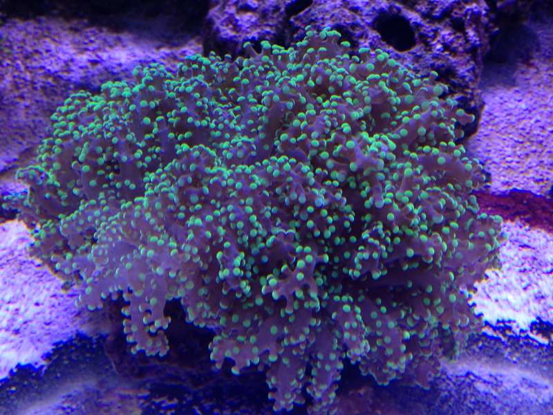 Sjovt nok så er de acan polypper der fik mest at spise gået fra "gråblå" til at have fået en del af Euphylliaens fluorescerende grønne farve.