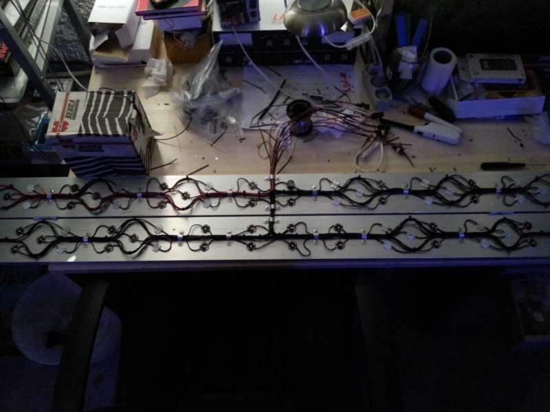 Linser eller ej tænker jeg stadigvæk over. Tænker at uden så spreder de 120 grader og må give noget mere diffust lys a la T5. Starter ud med linser på ca. halvdelen af de vandrette dioder så jeg får meget lys direkte ned mod bunden.