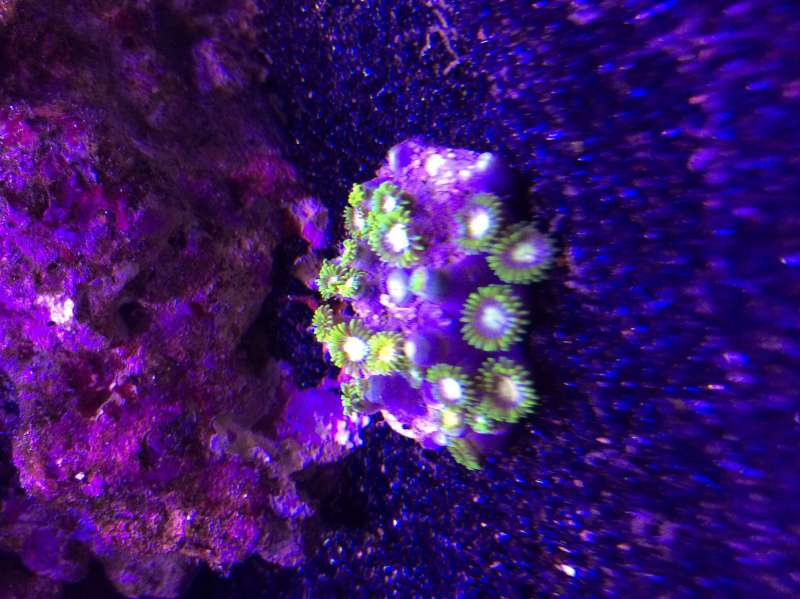 Jeg har en lille sten med Zoanthus Watermelon og en anden med grønne og gule polypper (kender ikke lige navnet på denne)
