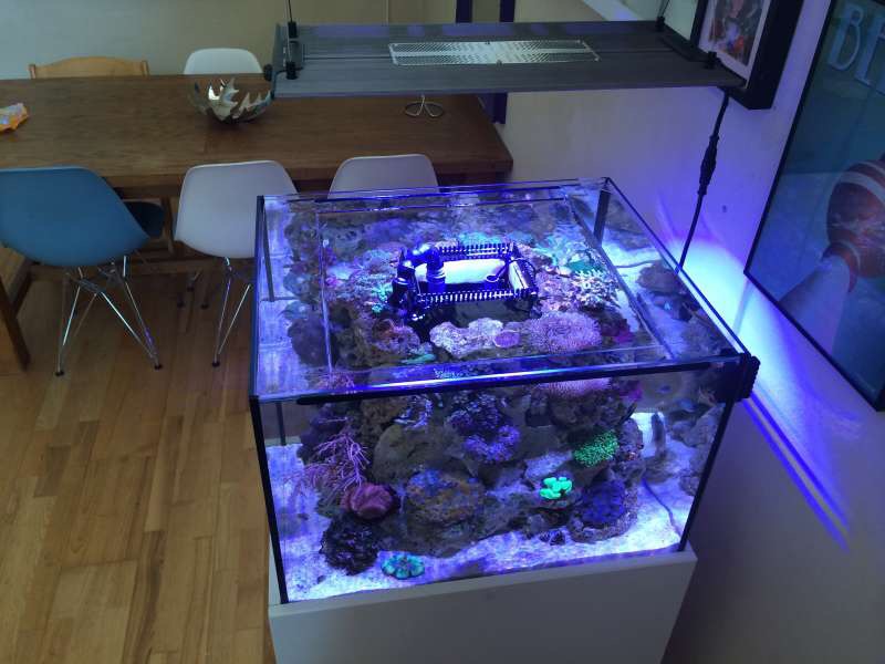 Efter en længere periode uden akvarie har jeg investeret en cube på 120 l med overløb i midten. Jeg kunne ikke lade være da det i min optik er det perfekte setup da alle "ruderne" er frie :wink: