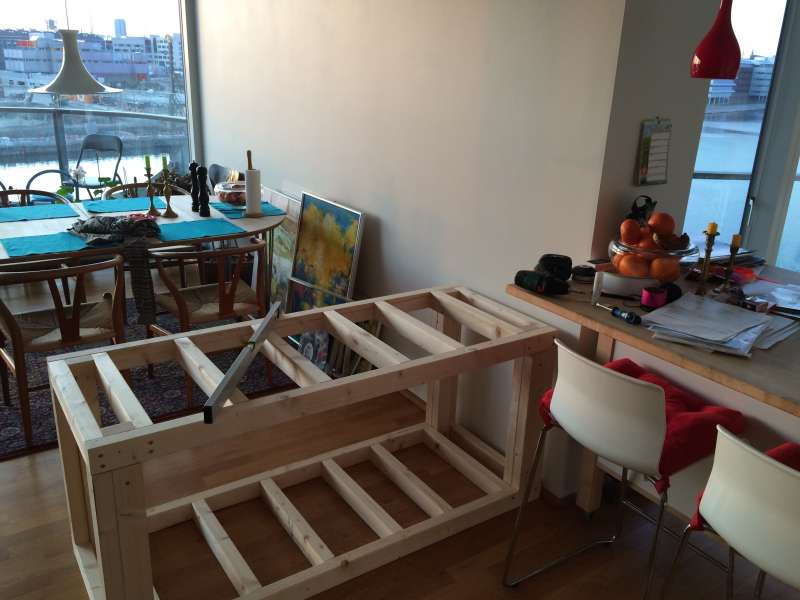 Der er ikke så meget hokus pokus i det møbel jeg er ved at lave. Har 540 liter vand i baljen så har vurderet at regler med dim 45x70 mm er store nok. Har så lavet 4 kantet rammer og her i mellem sat ben i den ønskede længde, det vigtigste er så at man efter dette saver nogle "mellem ben" der passer nøjagtigt i længde mellem de 2 4 kantede rammer. Jeg sætter også sådan 2 "mellem ben" mellem rammerne i midten. Mod gulv kommer der er plade der fordeler vægten yderligere. En plade som gulv i sump rum og en plade m flamingo øverst som baljen skal stå på. Derefter skal jeg have udtænkt noget beklædning og ind mod væg en "søjle" så lys kasse og bund hænger sammen designmæssigt og som skjuler rør og ledninger.
