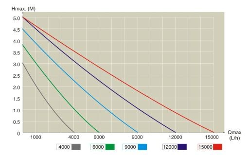Allerede ved 2 meters løft er den lovede vandmængde reduceret til omkring 4000 L/T eller 50% af max ved 0 meter. Ved 4 - 4,5 meter er det slut. Der leverer den ikke en dråbe vand. Det har jeg ikke testet men blot aflæst i deres eget skema. Her er f.eks. en RD pumpe NOGET bedre. Min RD6500 leverer 1750 L/T ved et løft på mindst 3 meter og 8 meter rør i alt (32 mm PVC med flere bløde vinkler og haner).