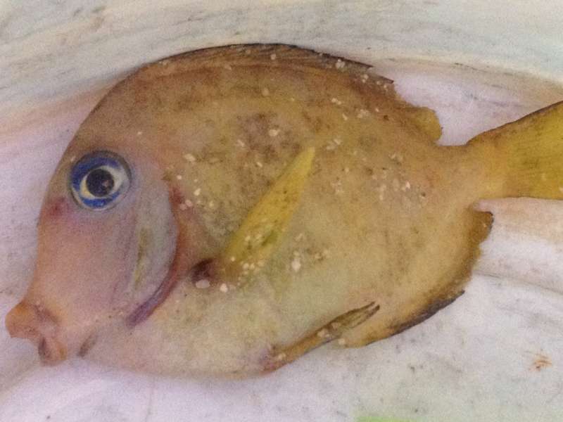 Ja det er nok ikke nemt og få taget billeder nu. Og ud fra billedet er det desværre ikke nemt og konkludere noget, så vil helst ikke komme med noget bud på hva det er. Uv når nok ikke og få en virkning på denne fisk men det er godt og have klar til en anden gang.