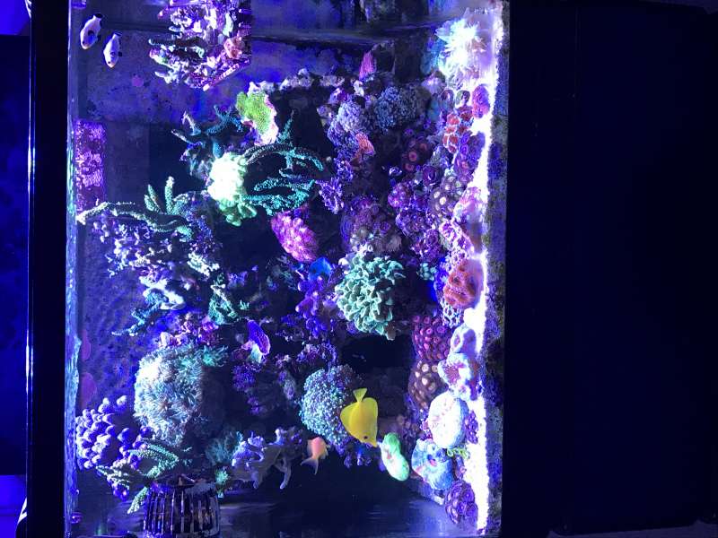 Fra begyndelsen var det meningen at akvariet blot skulle være et nemt og simpelt setup, - det holdt sådan cirka en lille uge ! Allerede ved genindkøring af det nyindkøbte og kørende reef, kom den gamle luksus saltvandsnørd op i mig, og siden har jeg opgraderet alt hvad der kunne forbedre akvariet og gøre det mere lydløst . Så i dag spiller det max, og alle fisk trives og de små 100stks koraller står alle pænt !