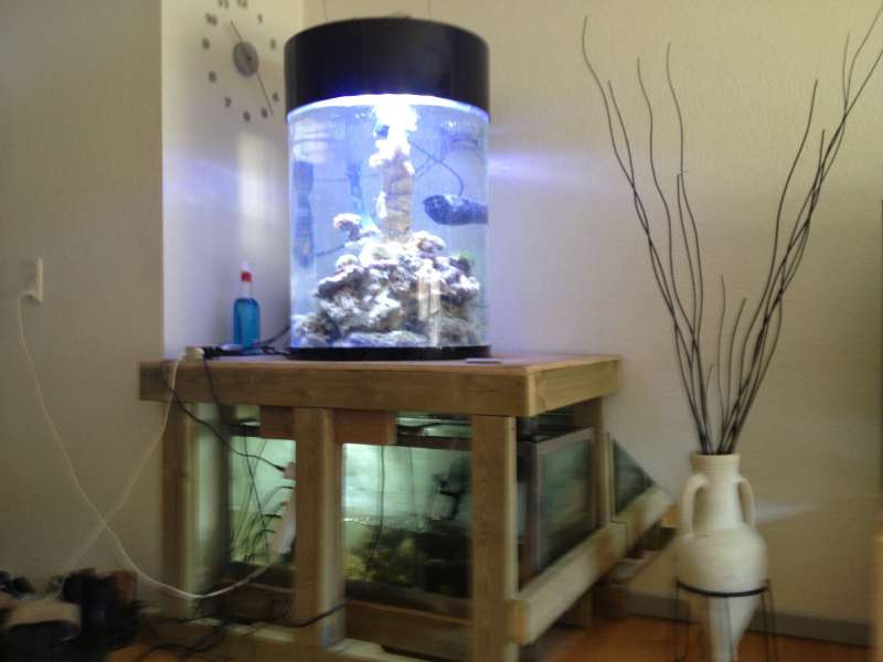 Her er et par billeder af mit. Fik løst det ved at sætte cirkulations pumpen halvt ned på bagsiden sådan at den pegede op på overfladen det gav et jævnt forskellig flow.